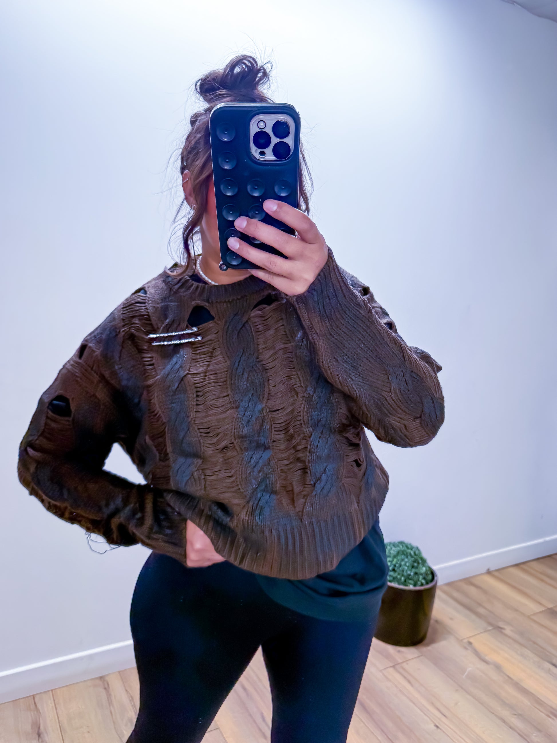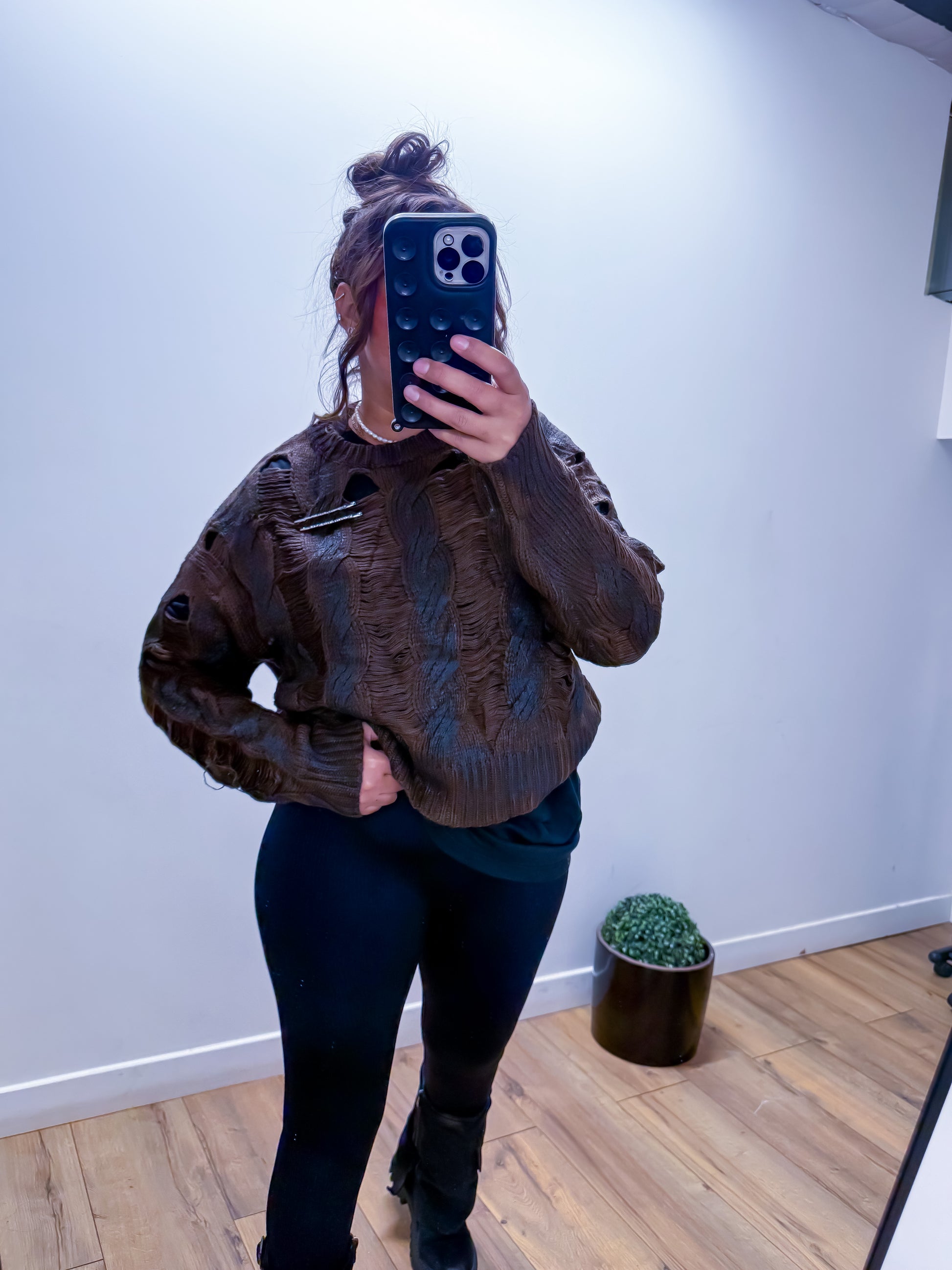 L'Énigme Chocolat est bien plus qu'un simple pull : c'est une œuvre d'art portable qui attire tous les regards. Son tricot ajouré crée un jeu de textures fascinant, tandis que ses tons chocolatés apportent une chaleur réconfortante à votre garde-robe. Portez-le avec un jean pour un look décontracté ou superposez-le pour créer des tenues audacieuses.