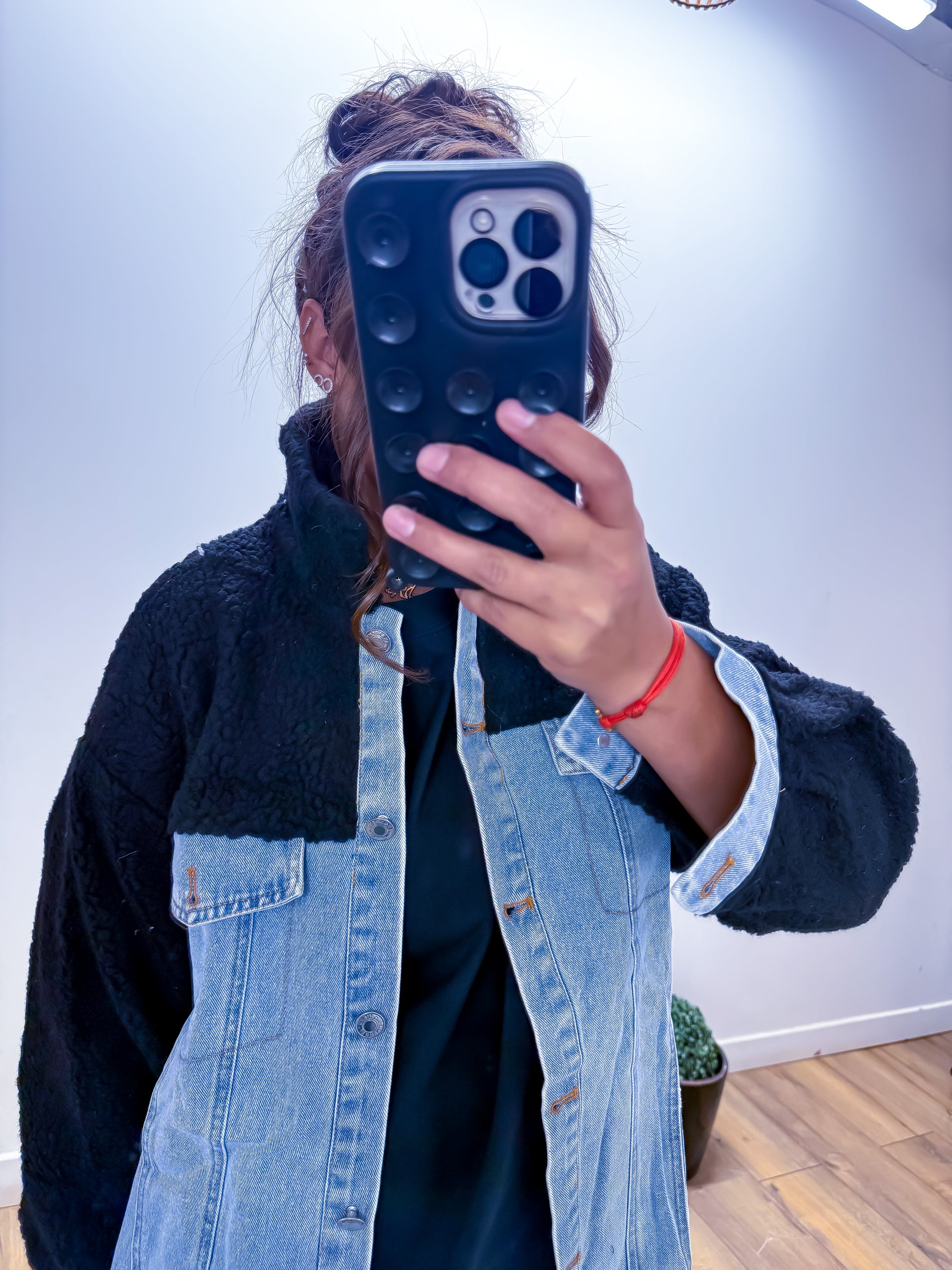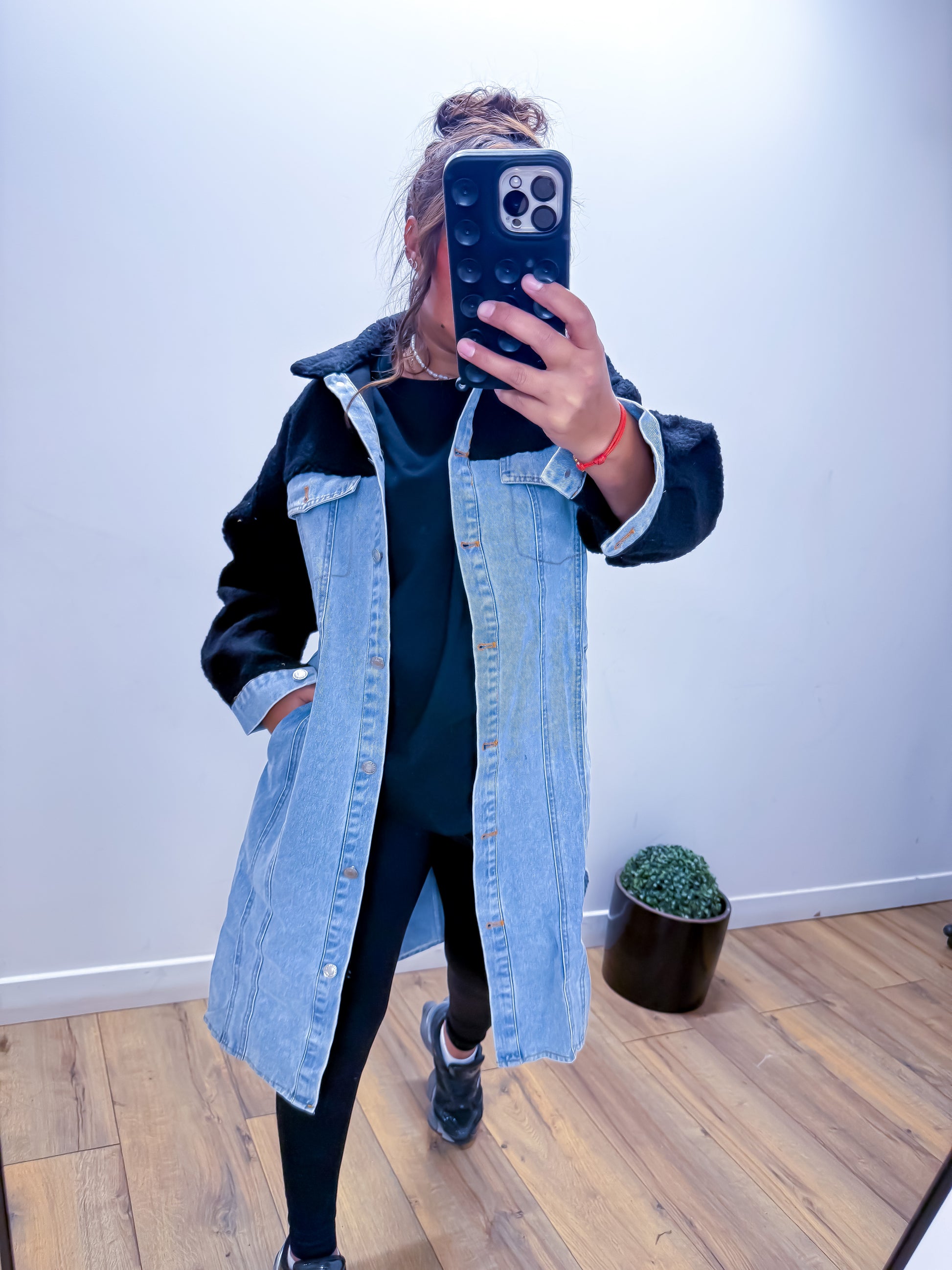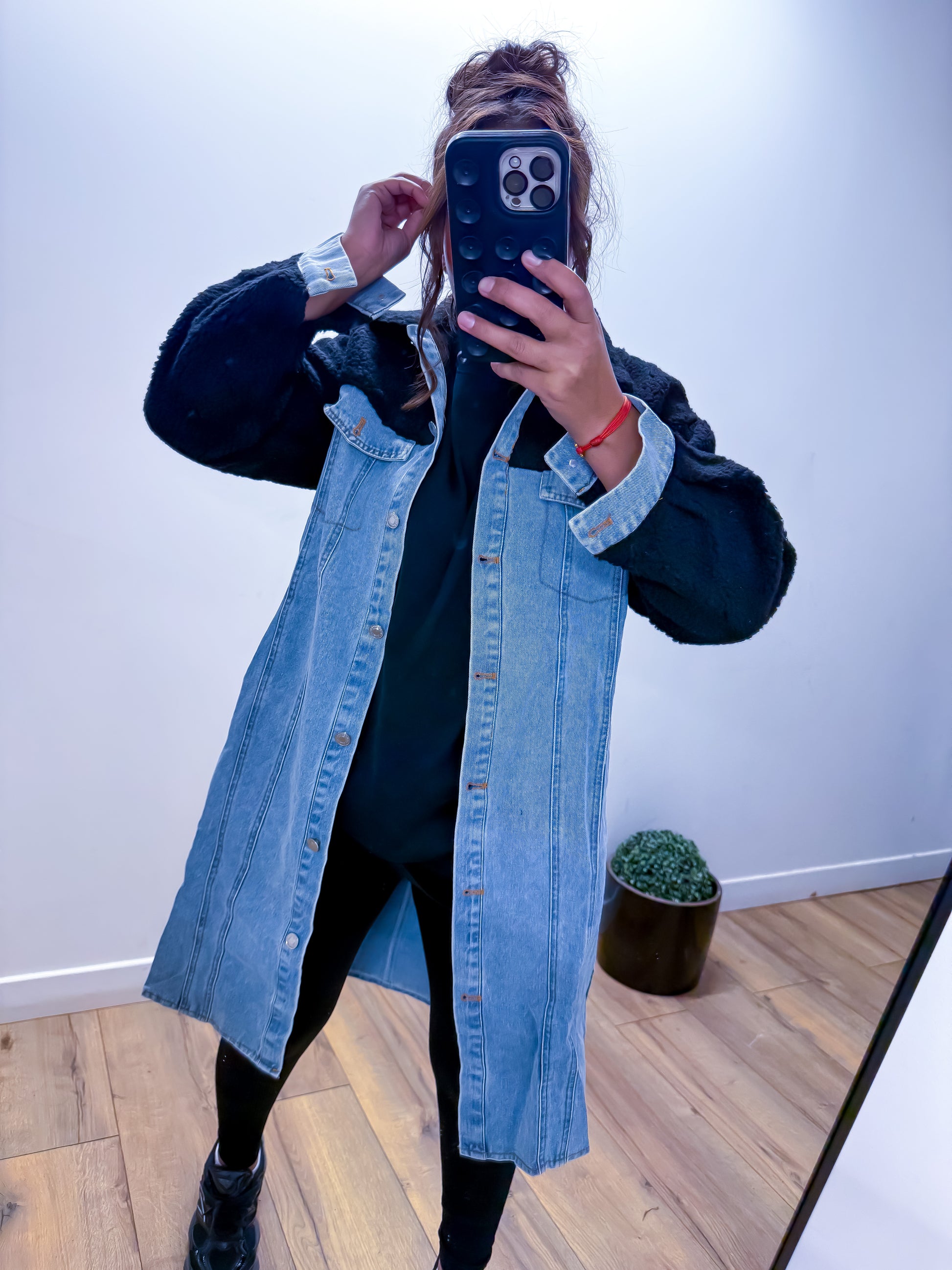 Découvrez L'Hybride Arctique, le manteau qui réinvente le style urbain en fusionnant l'authenticité du denim avec la chaleur enveloppante de la polaire. Cette pièce unique allie l'esprit rebelle du jean à la douceur réconfortante d'une doublure polaire noire.