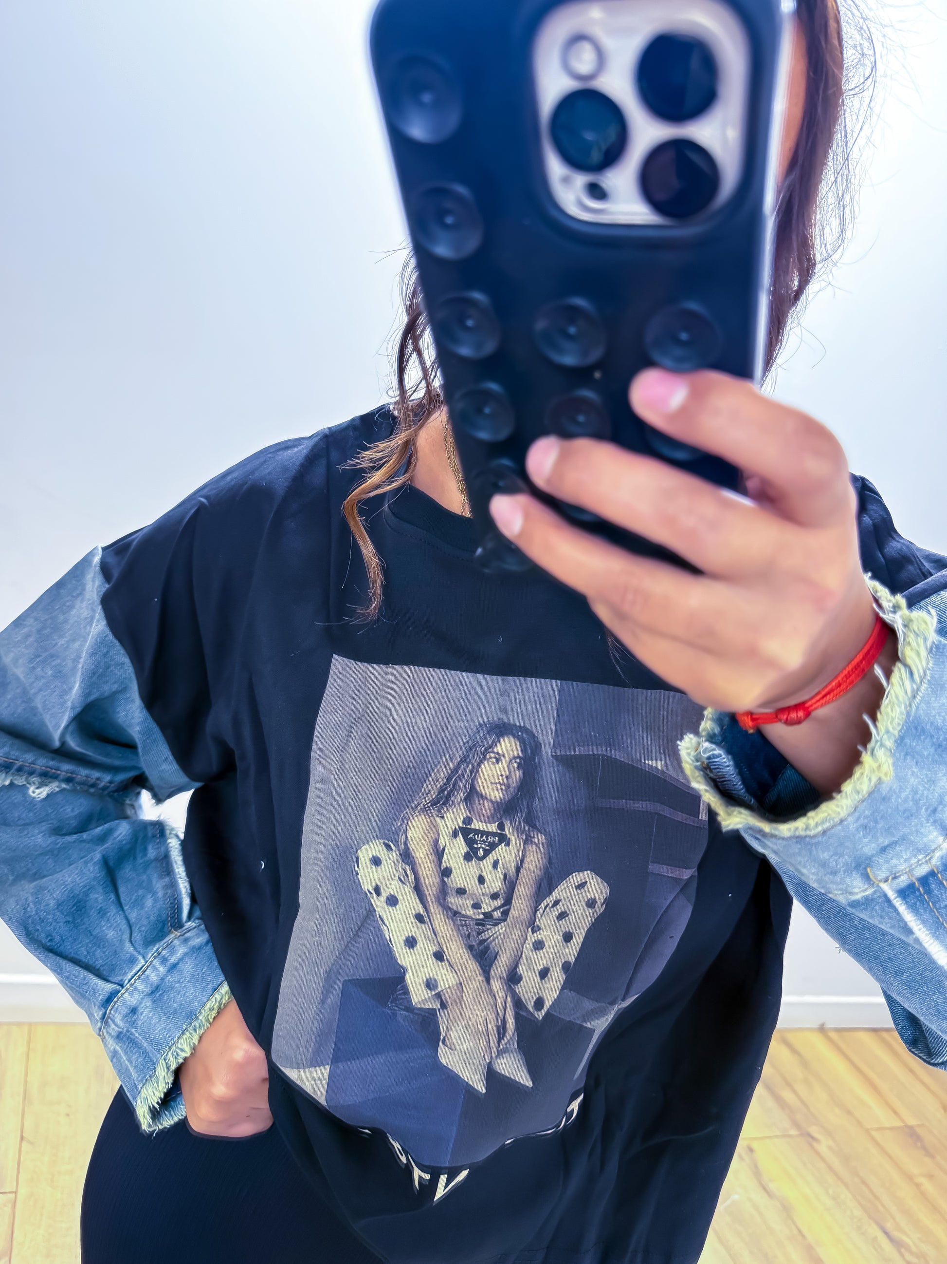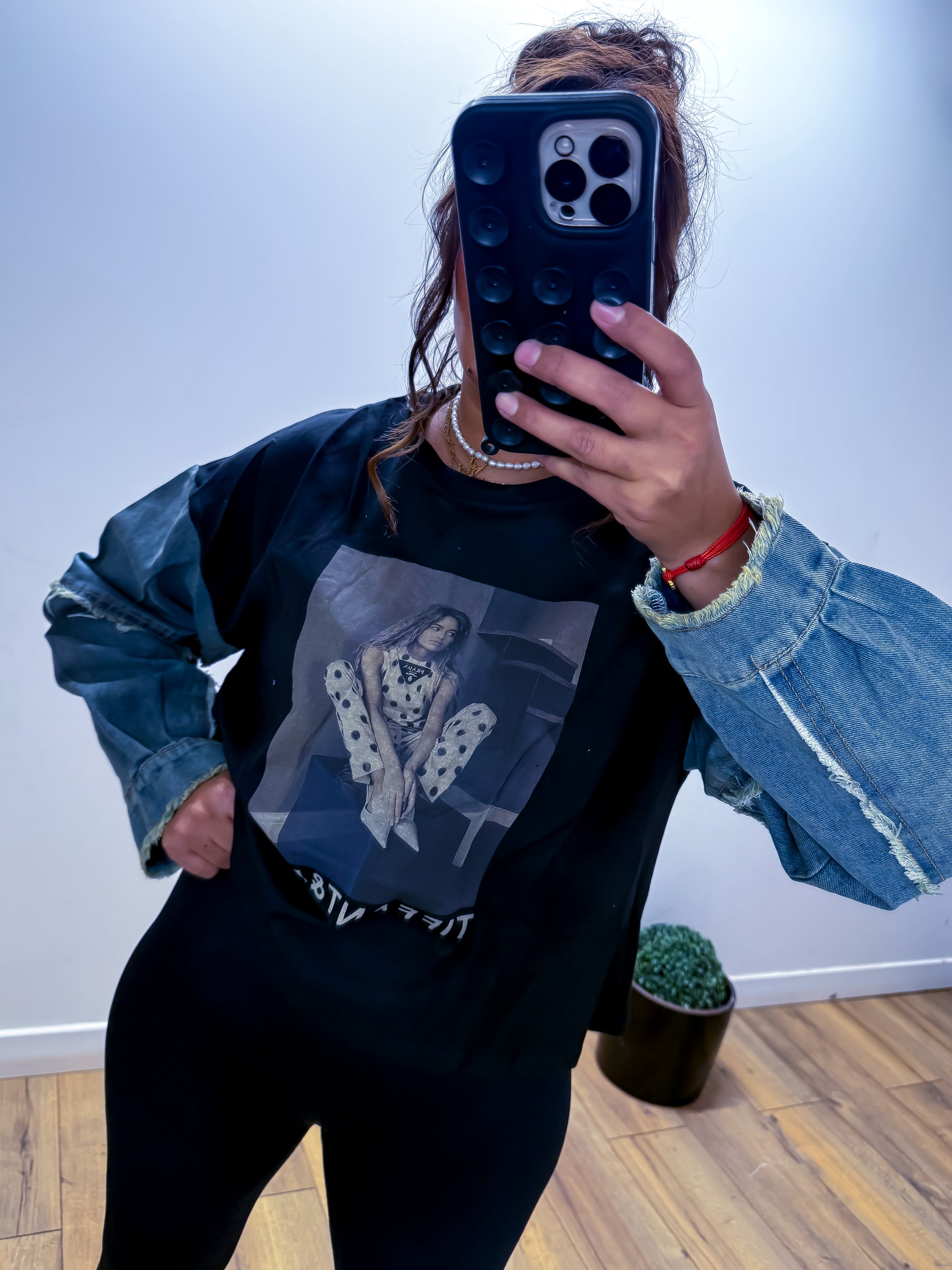 - Architecture bi-matière : corps en coton noir profond et manches en denim brut pour un contraste saisissant