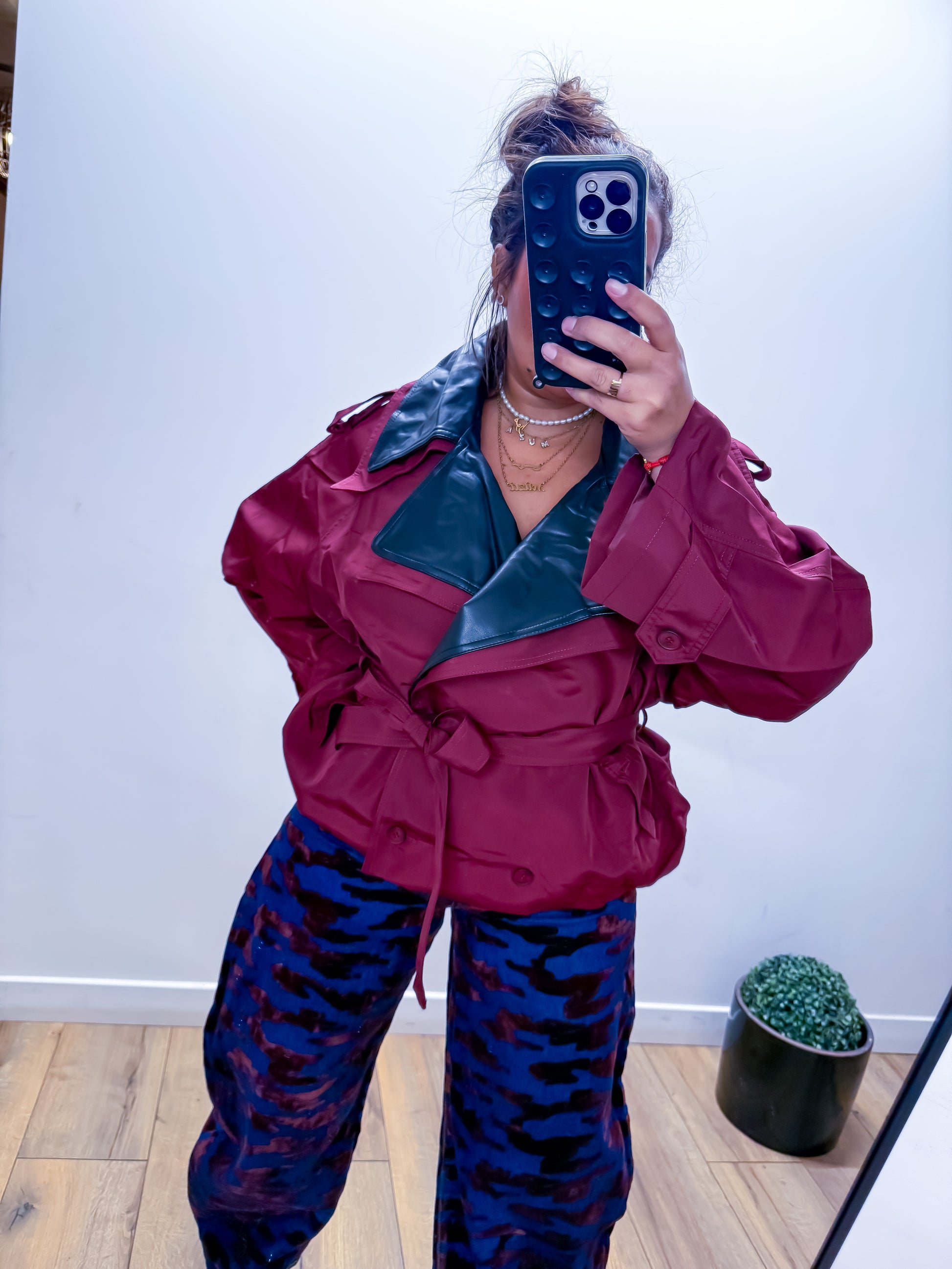 Sublimez votre style avec ce trench bicolore audacieux qui associe simili cuir bordeaux et détails noirs pour un look sophistiqué et moderne. Une pièce statement qui ne passe pas inaperçue.