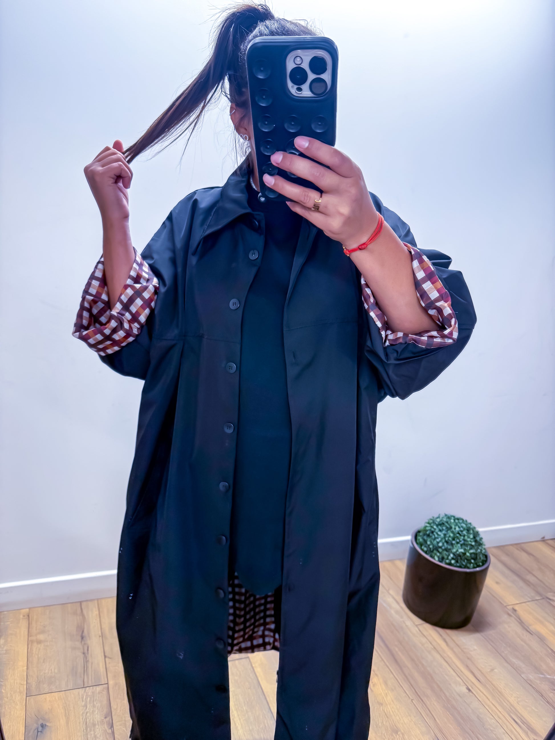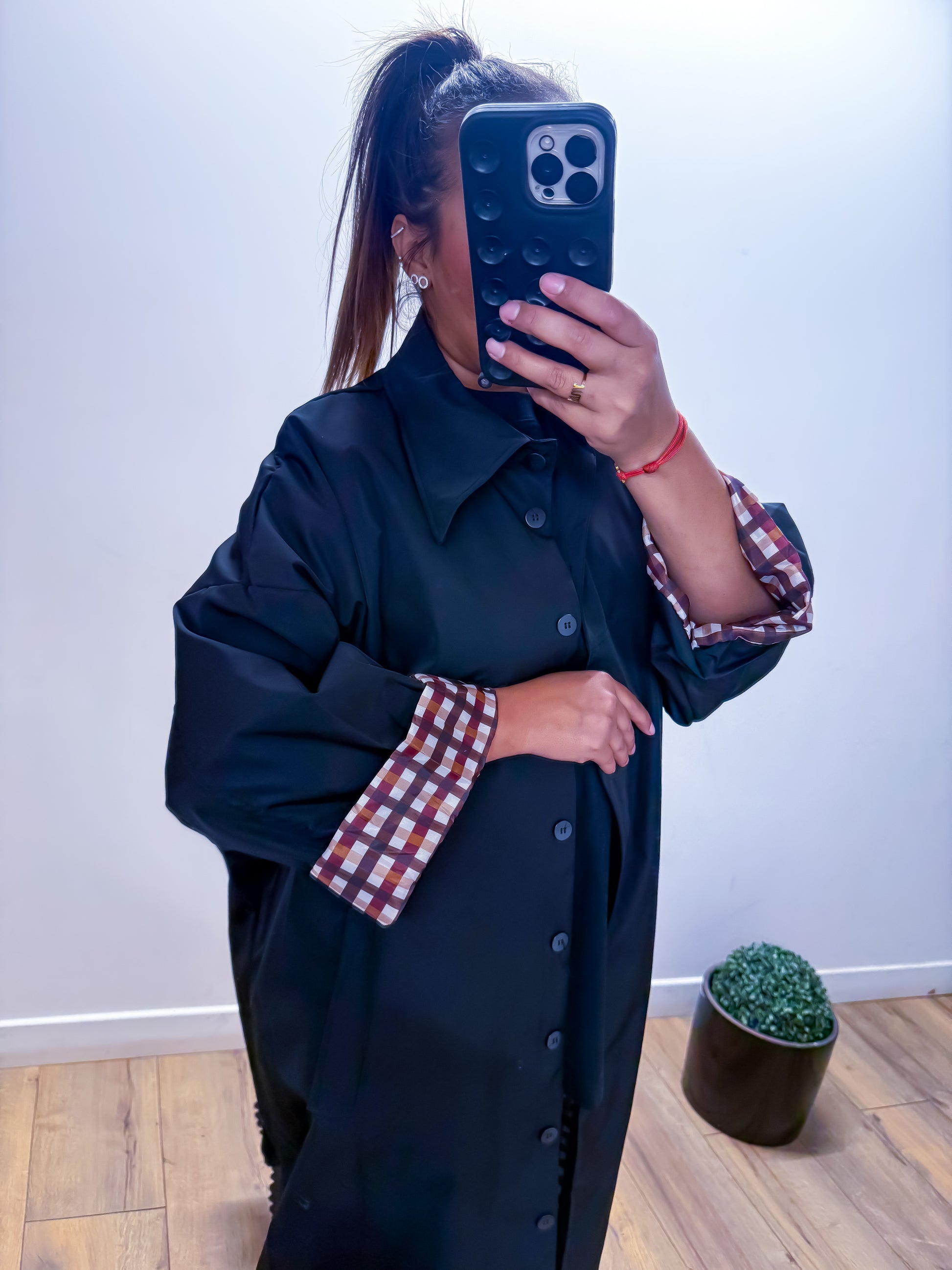 Trench imperméable noir élégant avec une doublure à carreaux contrastante. Cette pièce intemporelle allie style classique et détails modernes pour un look sophistiqué en toutes circonstances.